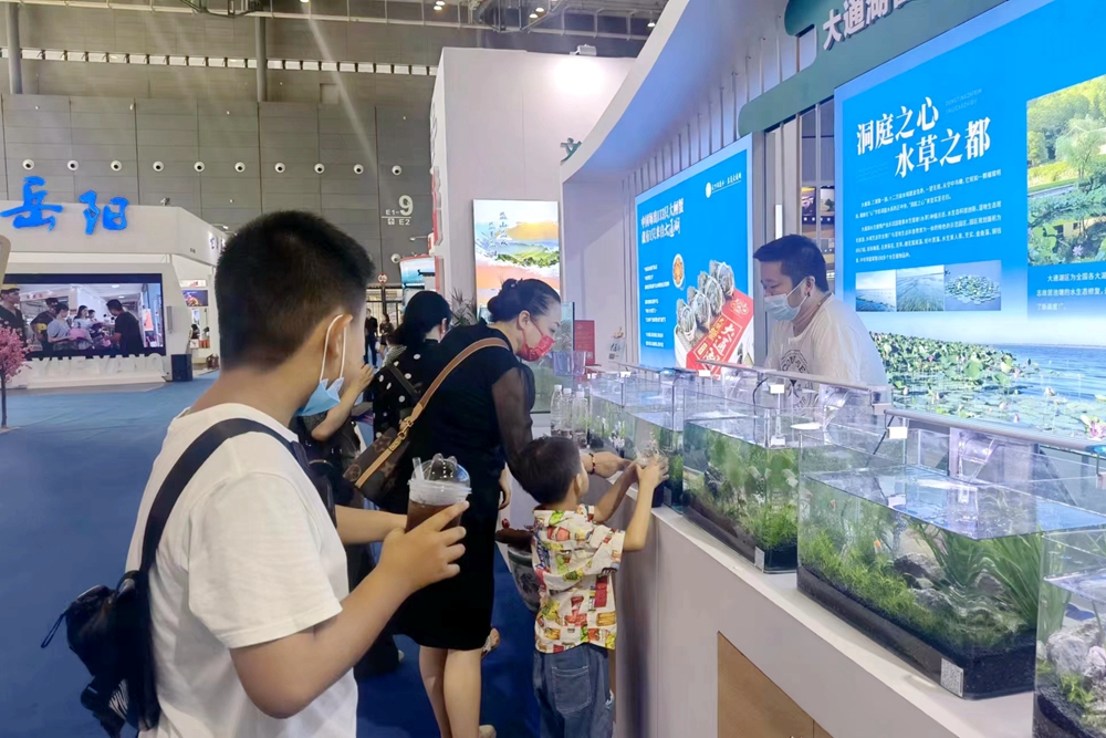 大通湖不仅是“中国河蟹之乡”,也是著名的“洞庭之心,水草之都”。在今年的旅博会上,大通湖带来了代表生态治理成效的水草生态缸文创产品以及有“六月黄”之称的大通湖蟹,充分展示了大通湖的水草文化和特色大闸蟹产业。精彩的蟹道表演、新业态的文创元素,让大通湖展区变得极具魅力,让参展观众体验到了大通湖区“旅游+”模式的多样精彩。