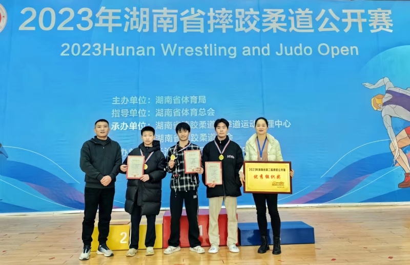 1月1日,2023年湖南省摔跤柔道公开赛在长沙圆满落幕。沅江摔跤健儿解文哲、李成宇、胡凯祥表现出色,斩获“三金”,分别夺得男子-50kg级、+55kg级、-42kg级冠军,沅江代表队获得优秀组织奖。