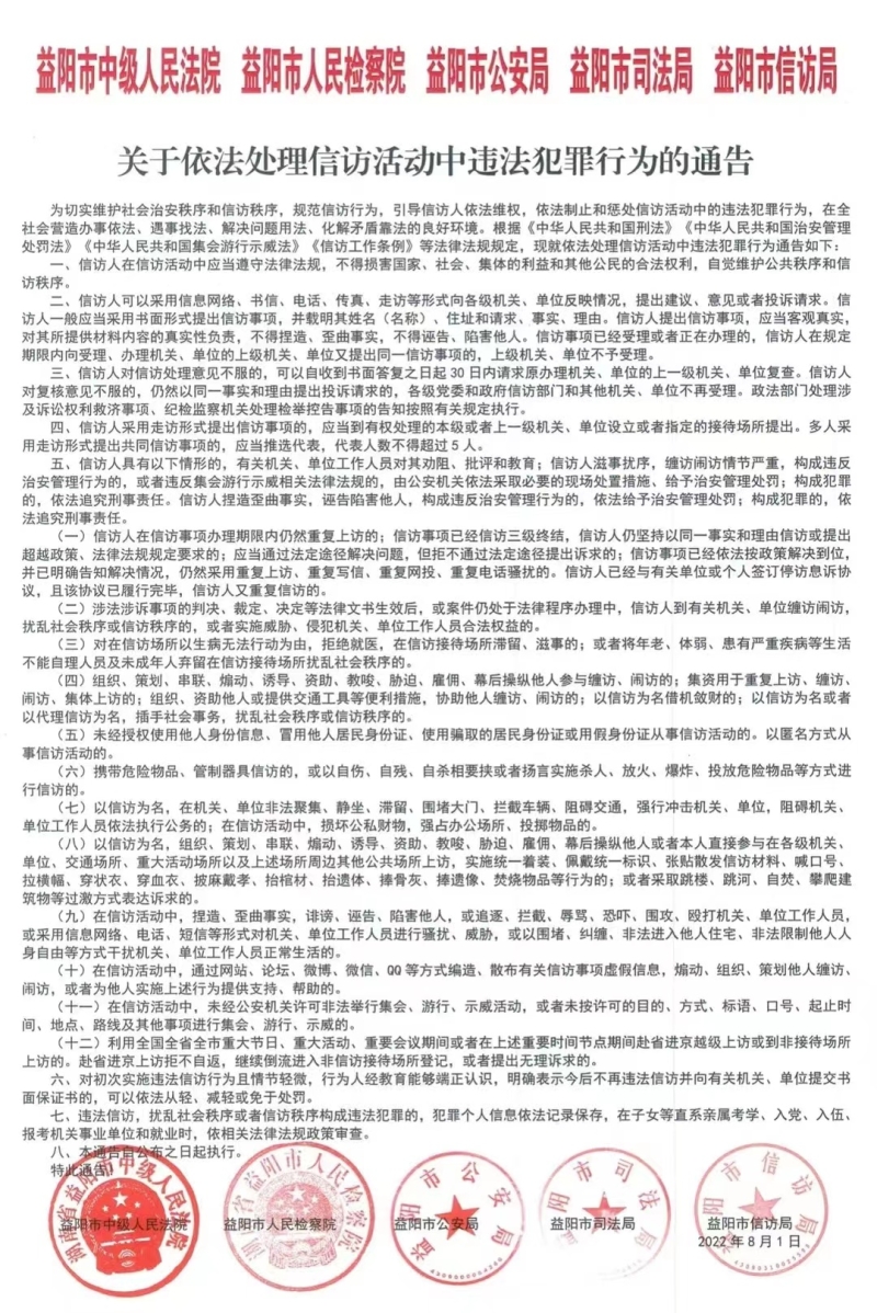 益阳市关于依法处理信访活动中违法犯罪行为的通告