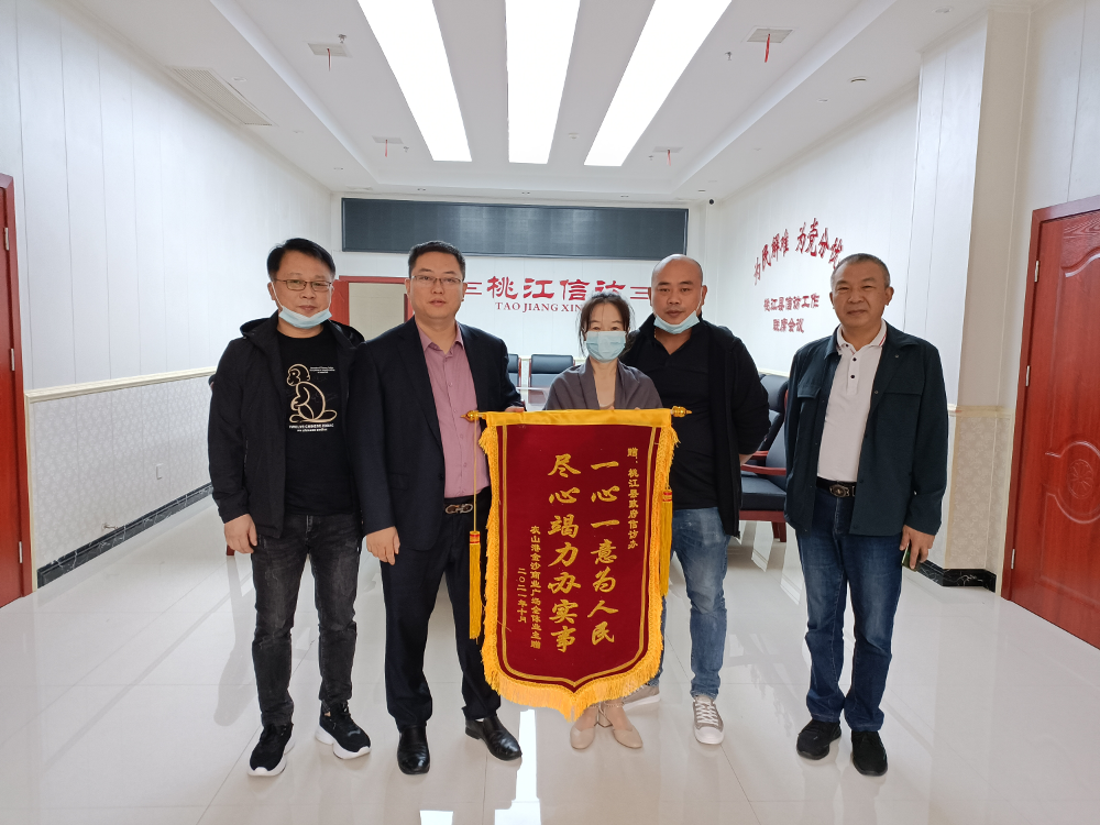 10月8日上午,桃江县人民来访服务中心大厅出现温馨一幕,该县灰山港镇金沙商业广场的信访群众代表将一面印有“一心一意为人民 尽心竭力办实事”的锦旗送到县信访局工作人员手中,表达他们对该局积极协调、妥善解决其信访难题的感激之情。