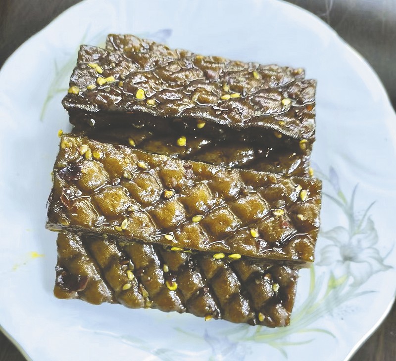 好食材的根本,来自于好物料。“水,是有灵性的。只有水用好了,做出的香干才会别有一番风味。”刘伯元说,做香干只能用本地竹山湾流淌的、含有石膏成分的山泉水。同时,做香干的手艺方法独特,一般都是各家祖传父教,且经过长期练习才能掌握其中的要领。如此,做出的香干才会色泽黄亮,块型方正,质韧而柔,味咸而鲜爽。“逢年过节,我们的餐桌上都会有一道和香干搭边的菜肴。”刘伯元告诉记者,平口香干可卤制、腌制,还可作炒菜等,做法颇多,都很好吃。