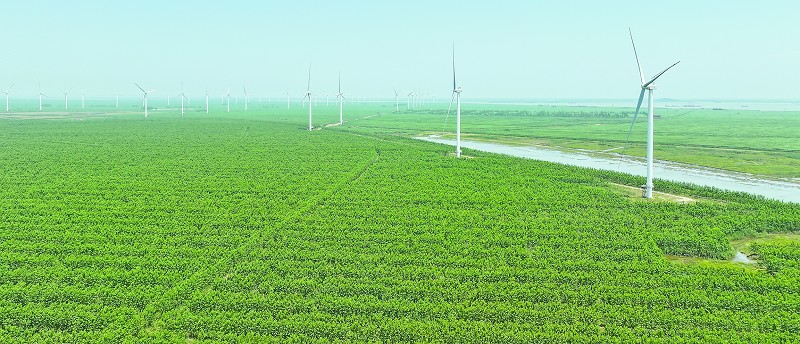 一望无际的漉湖芦苇洲上,风力发电装置迤逦排开,源源不断输送清洁能源。黄云摄