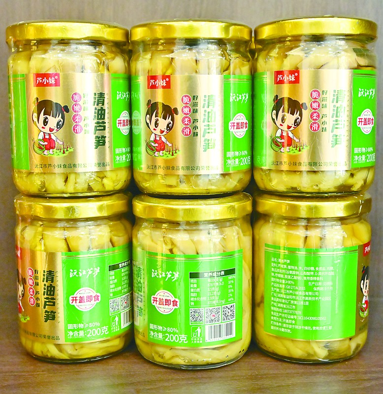 生产车间里,工人将采收处理后的原料进行精选、称重、密封、杀菌等多道工序,制成芦笋食材、芦笋即食等系列产品。沅江市还与湖南农业大学、湖南省农业科学院等院校建立了长期稳定的技术合作关系,开展沅江芦笋共性关键技术的研究与产品研发,通过产学研合作和成果转化,研发和上市了芦笋食材、芦笋即食产品、芦笋面条、芦笋饮料、芦笋酱等9大系列共20多种精深加工产品。作为一种得天独厚、特色鲜明的地方物产,沅江芦笋是农业农村部“农产品地理标志登记”产品、国家“地理标志证明商标”产品、湖南省十大农业区域公用品牌和“一县一特”主导特色产业。