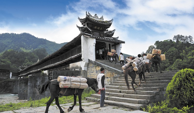 茶人运送茶叶走过安化县永锡桥。周德淑摄