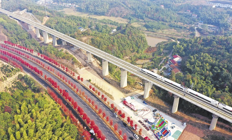 ▲新近开通的常益长高铁,“邂逅”益阳最美红枫大道。 吴胜琳摄