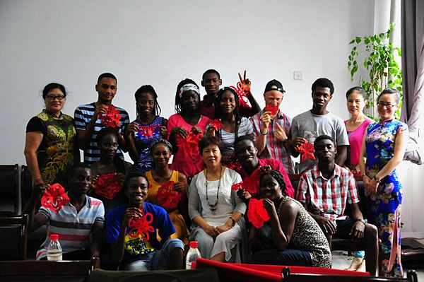 《梅山剪纸》传承人向亮晶教老外学剪纸