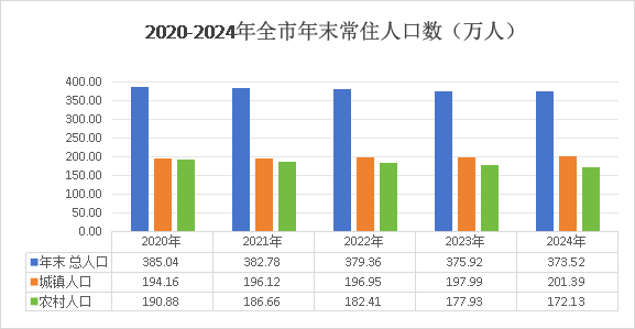 截至2024年年末,益阳市户籍人口453.37万人,常住人口373.52万人。常住人口中,城镇人口201.39万人,占53.9%;乡村人口172.13万人,占46.1%;男女性别比103:100。