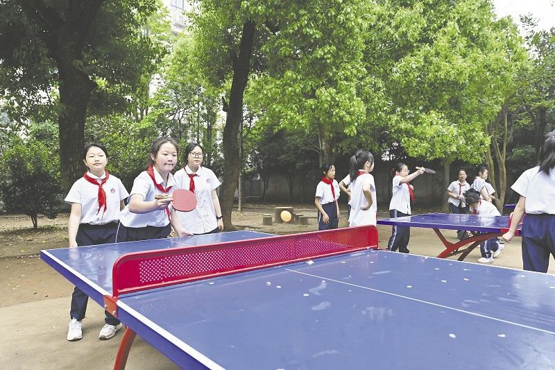 ▲下课铃一响,学生们第一时间抢占乒乓球台。
