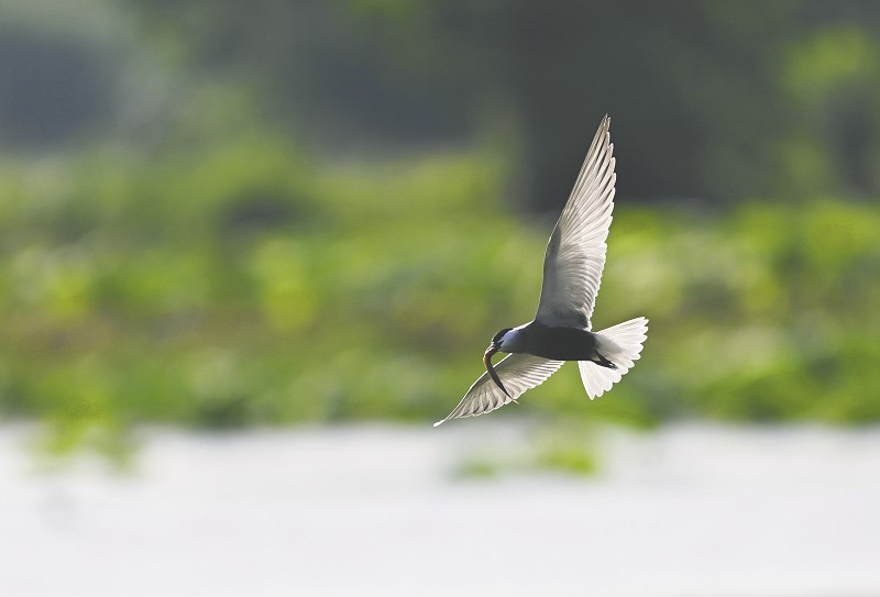 6月5日,资阳区张家塞乡黄金湖碧波荡漾,荷叶青翠,成群结队的须浮鸥和水凤凰衔草筑巢,为繁殖季忙碌。湖边的田野上,白鹭和须浮鸥和谐相处,好一幅水清草绿、候鸟翔集的生态画卷。