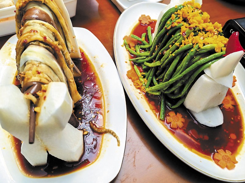 茄子豆角的创意美食。夏训武摄 茄子豆角是家常菜,但如果厨师别出心裁,来点创意,也可以做出“看点”。这里推介的“紫茄瀑布来、碎金熠熠缠翠豆”,其实就是茄子豆角的新做法。 ...