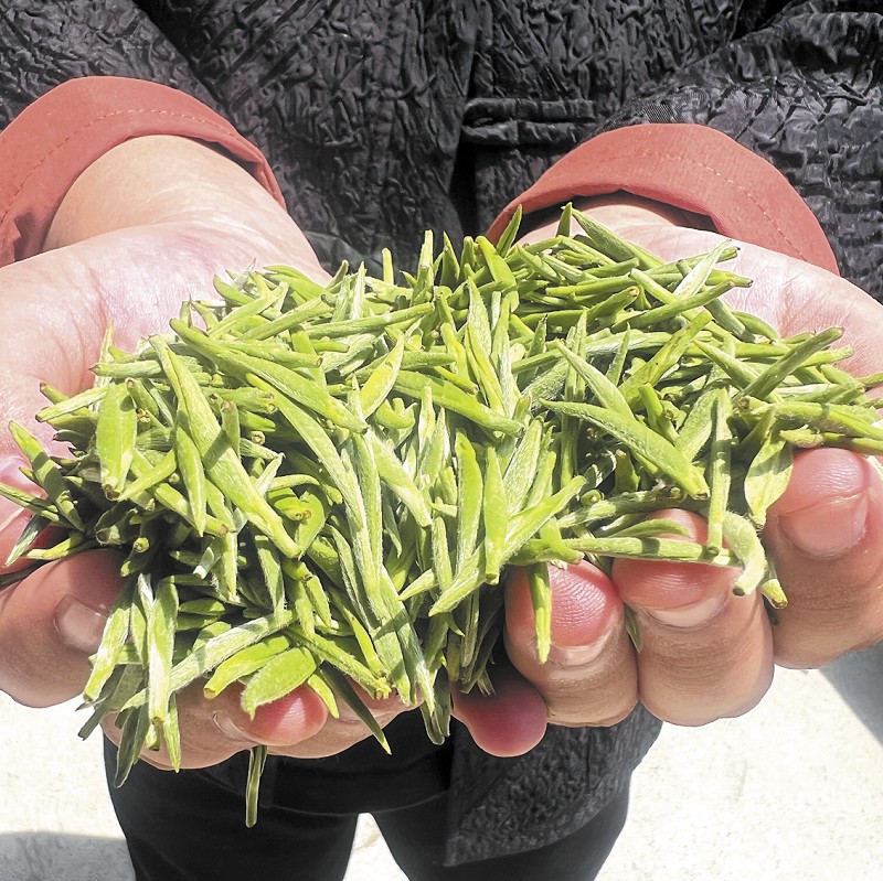 甘果摄 4月3日,安化县仙溪镇洢水四保生态农业开发有限公司内茶香四溢,50余名茶农陆续交售清晨采摘的嫩绿茶芽。企业品牌主理人吴江宇仔细检查茶芽,确保茶叶的优质与鲜嫩。