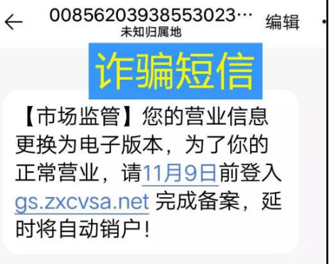 “您的执照显示状态异常,请于XX月XX日前进入XX网站自助更新,延时将收到处罚。”