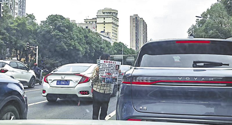 5月24日,记者在益阳大道与大桃路交界处看到,一女子手拿一块“求助牌”钻入车流之中,逐个敲开等绿灯的汽车车窗,向驾驶员乞讨,实在危险。 胡勇鹏 摄