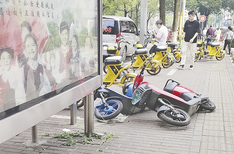 5月15日,记者在中心城区大桃北路看到,两辆小黄车横倒在人行道上,不仅有损市容,还影响市民出行。
