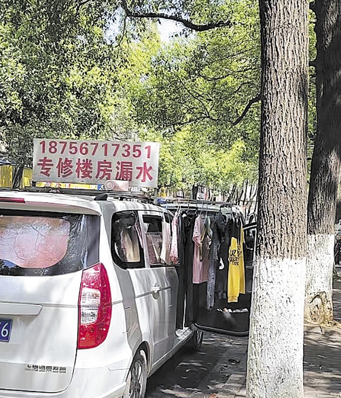5月31日,记者在中心城区滨江东路看到,一车顶立有“专修楼房漏水”的揽工车辆停靠在马路边,车门上方伸出支架晾晒衣服,很不雅观,影响城市文明形象。