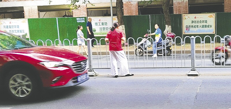6月13日,记者在中心城区滨江路看到一市民站在马路中央隔离栏前与对面的人交谈。图一时方便,无视身后川流不息的车辆,有违交通规范,置自身于危险之中,实在不该。
