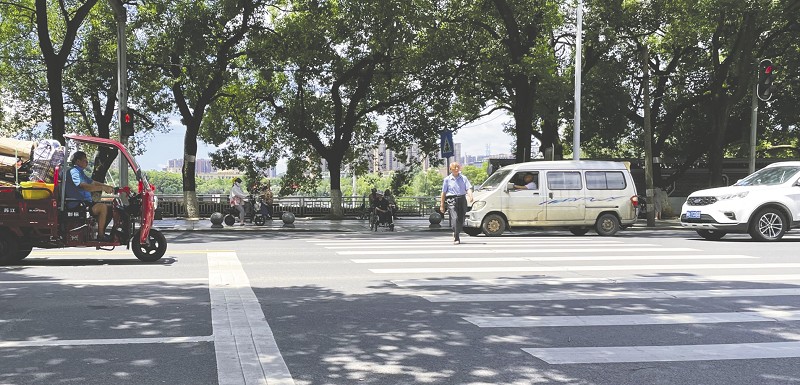 6月27日,中心城区秀峰公园北门的红绿灯路口,一老汉在红灯亮起时横穿马路,险些引发交通事故。