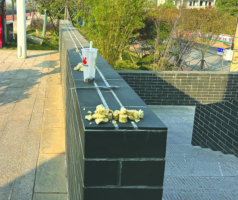 11月23日,记者在资江风貌带北岸看到,有游客在围墙上随意丢弃甘蔗渣和奶茶杯,而就在旁边不远处有一个垃圾桶,但游客却没有选择将其投放到垃圾桶内。此举无疑影响了市容市貌。
