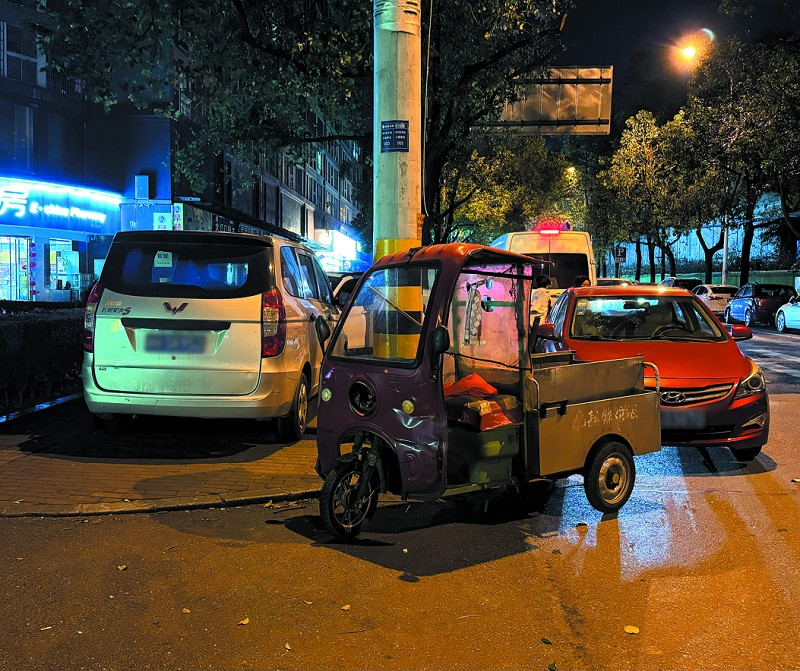 2月18日晚,赫山区大桃北路私家车违停行人道,妨碍通行,行人只能走马路,存在安全隐患。呼吁司机规范停车,共同维护通行秩序。 刘行剑 摄