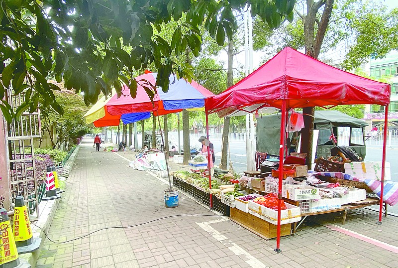 4月8日,在资阳区金花湖西路三益街路口公交车站附近,记者看到几名卖菜商贩搭着帐篷,把摊位摆在人行道上,既妨碍行人通行,又影响环境卫生。