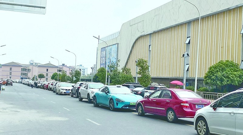 4月27日,正值周末,赫山区万达广场后侧一带乱停车现象严重,马路中间的黄色虚实线上停满了车辆,许多车辆临街停靠,未停放在停车位里。