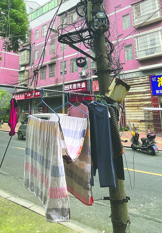 5月8日,在赫山区秋果路附近,记者看到马路的电线杆上密集缠绕着很多电线。附近的居民为了方便晾晒衣物,把晾衣架直接搭在电线上,存在安全隐患。