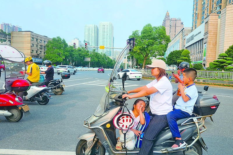 5月22日17时20分,记者看到一女子驾驶摩托车在中心城区康富北路益阳华天大酒店一侧的红绿灯前等候。她的后座坐着一个小男孩,前面踏板上蹲着一个小女孩,女孩的头盔挂在把手上,存在安全隐患。