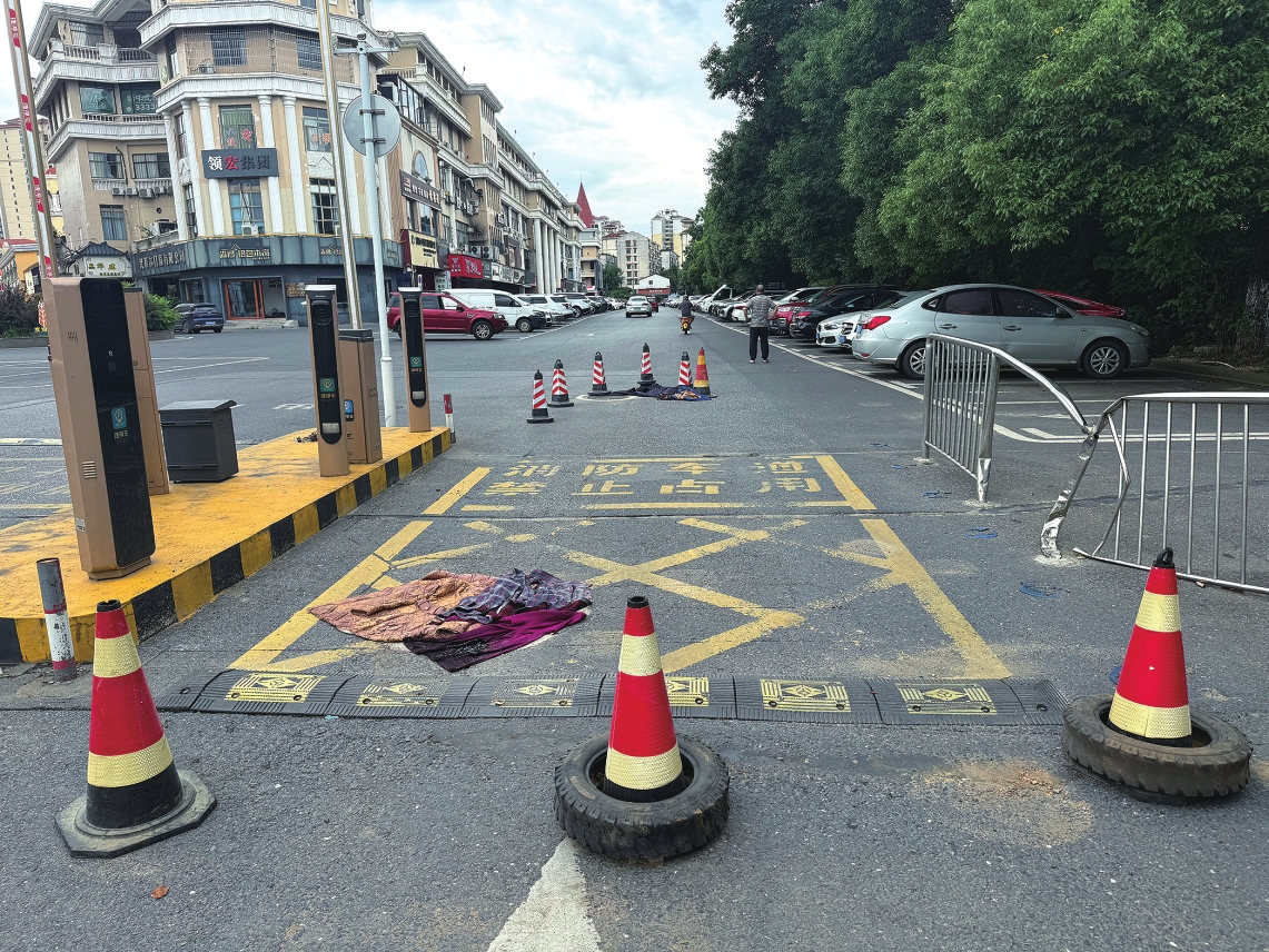 6月18日,记者在中心城区福中福广场西门入口处看到,栏杆损坏,交通锥随意摆放,还有杂物堆积,既破坏市容市貌,也给车辆进出增添安全隐患。
