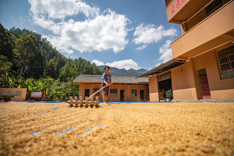 10月3日,重庆市酉阳土家族苗族自治县花田乡何家岩村村民在晾晒水稻。新华社记者 黄伟 摄