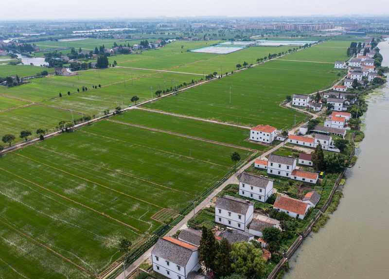 空中俯瞰浙江省嘉兴市嘉善县西塘镇红菱村的连片稻田和美丽村居(7月13日摄,无人机照片)。新华社记者 徐昱 摄