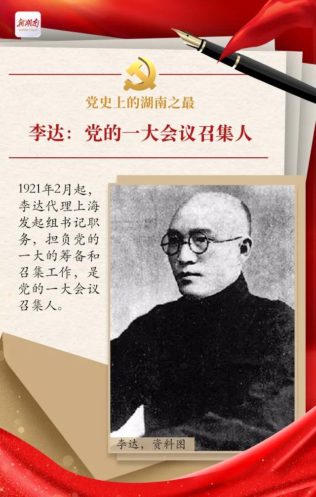 1921年7月23日,中国共产党第一次代表大会在上海开幕,出席会议的湖南人有李达、毛泽东、何叔衡和周佛海。会议期间,李达代表上海发起组介绍了自成立以来的工作情况,并和张国焘、董必武共同起草了供会议讨论的党纲和今后实际工作计划。7月31日,由于会议引起了敌人的注意,经王会悟安排,代表们悄悄转移至嘉兴南湖一艘游船上召开了最后一次会议。会议通过了中国共产党第一个纲领和决议,确定党的名称为“中国共产党”;决定设立中国共产党中央局,作为中央的临时领导机构,由陈独秀任书记,李达被选为中共中央局宣传主任。