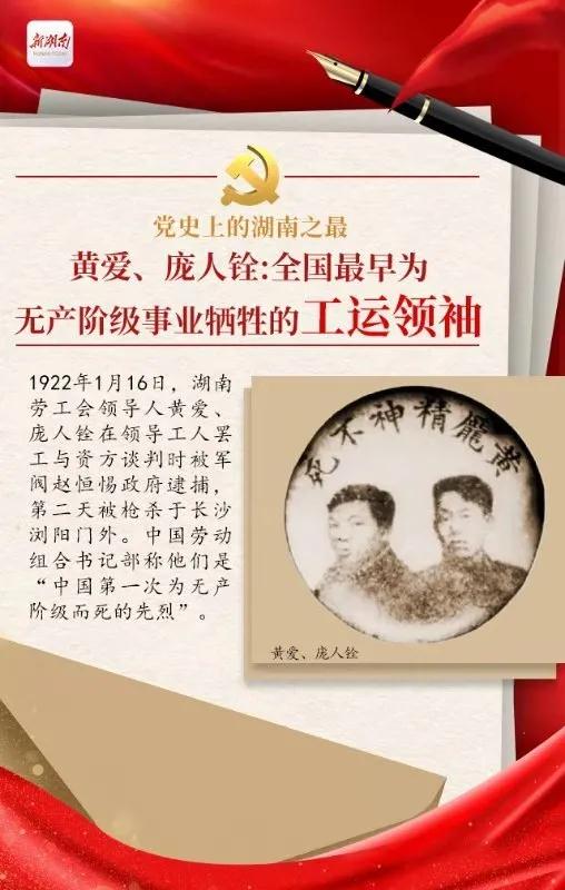 黄爱、庞人铨,这两个年龄相仿、出身相似、求学经历重合的湖南伢子,因领导工人运动,于25岁的青春年华双双壮烈牺牲,成为全国最早为无产阶级事业牺牲的工运领袖。