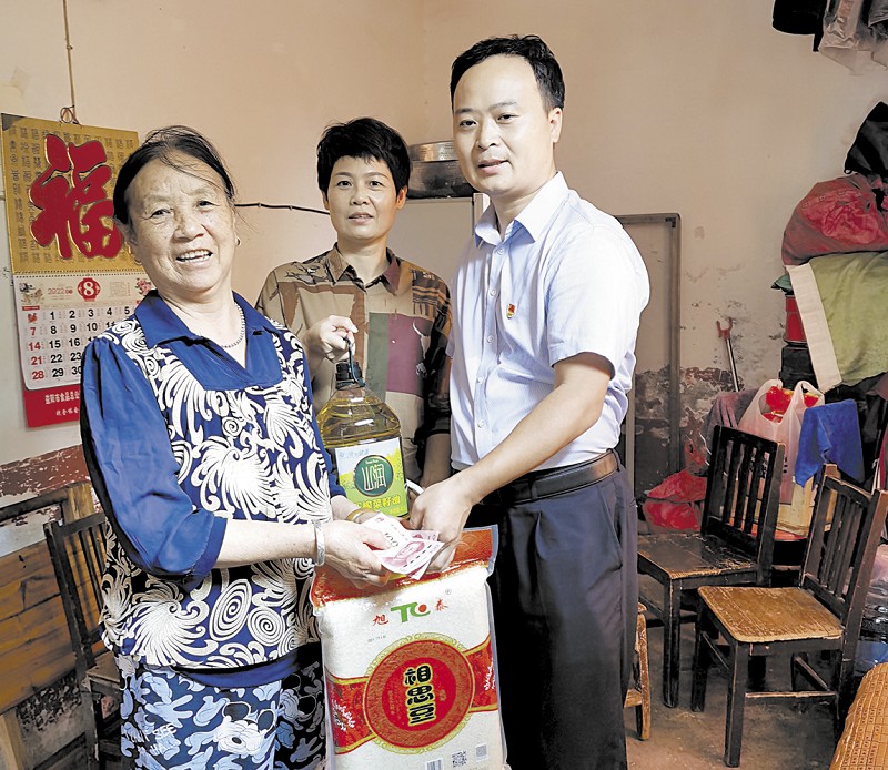 郑琳看望社区困难群众,送去米、油、现金的同时,对他们嘘寒问暖。