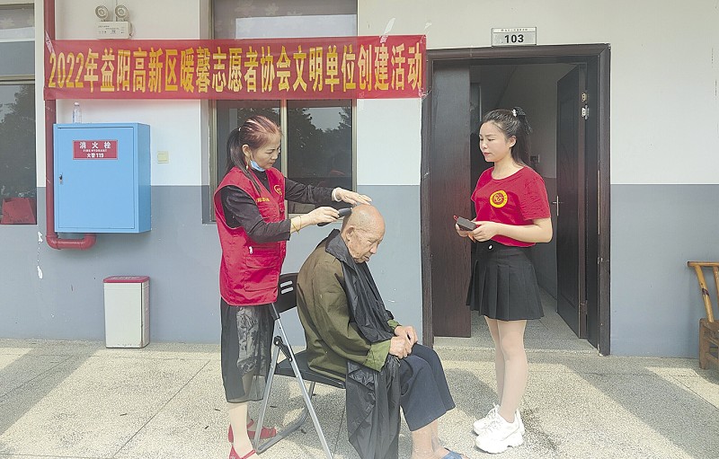 陈爱梅(左)给老人理发。