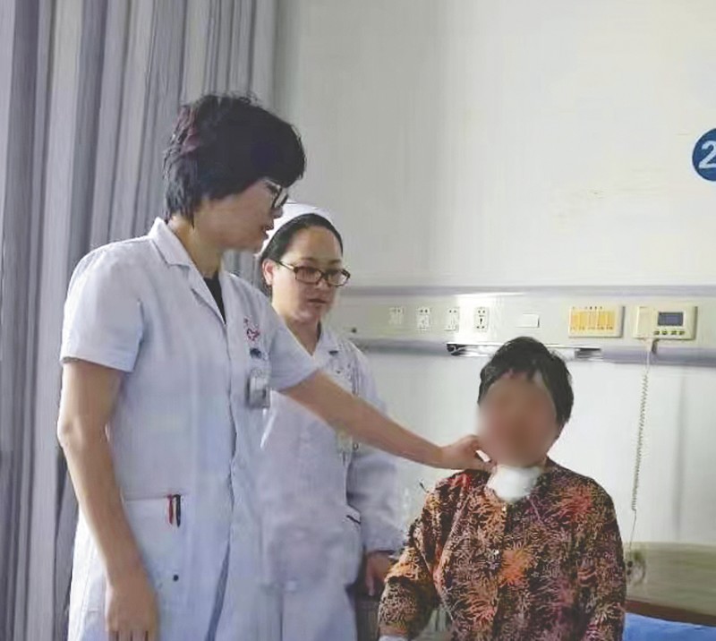 60多岁的谌爷爷因甲状腺癌导致食管气管都进行了重建。由于需要一直插着胃管,谌爷爷觉得痛苦不堪,半夜趁人不注意自行拔掉胃管,但此举意味着病人无法正常进食,将严重危害身体健康。医护人员冒着巨大的风险通过食管气管重建手术,又重新为谌爷爷插上了胃管。同时,为了确保谌爷爷得到最好的治疗效果,科内在人手紧张的情况下给谌爷爷专门安排了24小时不间断特护,对谌爷爷进行悉心劝导和看护。最后,经过一个月的悉心治疗,谌爷爷成功治愈出院,谌爷爷及其家属都对治疗效果感到非常满意。