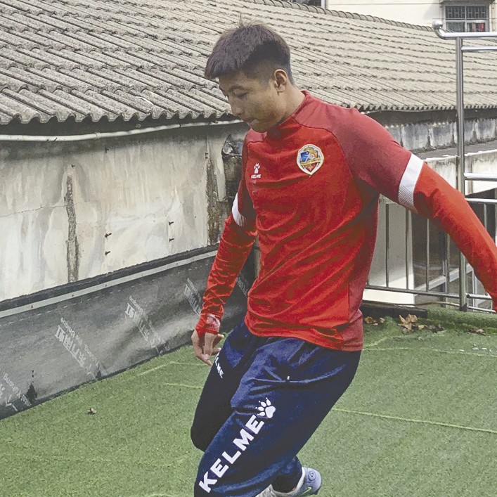 气温骤降,寒风凛冽,近日,在市十三中绿茵场上,刚参加完省足协杯青少年锦标赛的雷博翔正在进行足球训练,黝黑的肌肤上挂满了汗珠。