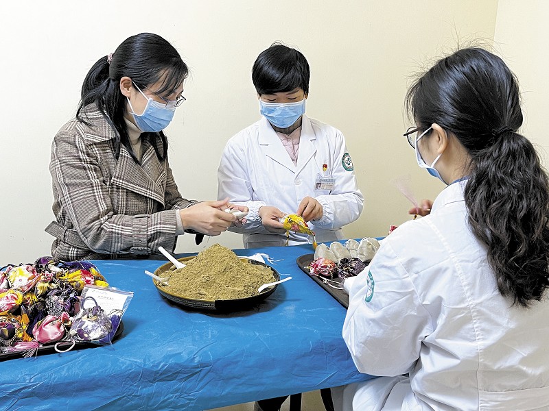 刘丽红与医护人员在制作防疫香囊。吴巧摄