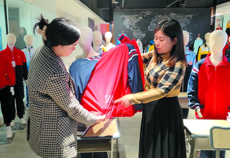 刘梦丽(右)在跟客户沟通校服的设计细节。苏钢摄