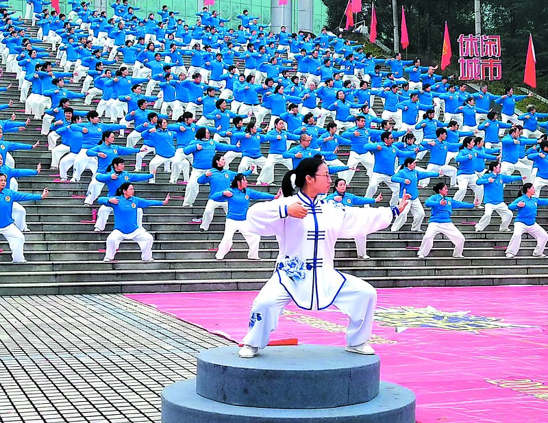 大众运动会集体展示中,廖玉美领做示范。陈浩军摄