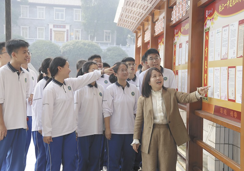 课间休息时,周黛和学生在学校文化长廊前交流。卢静摄