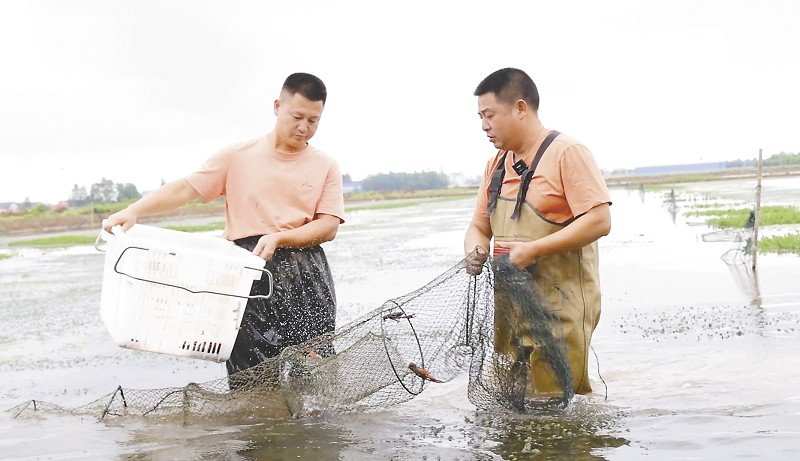 一清早,覃刚强(右)和工人一起忙着下塘捕虾。李娜摄