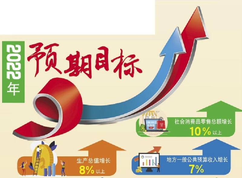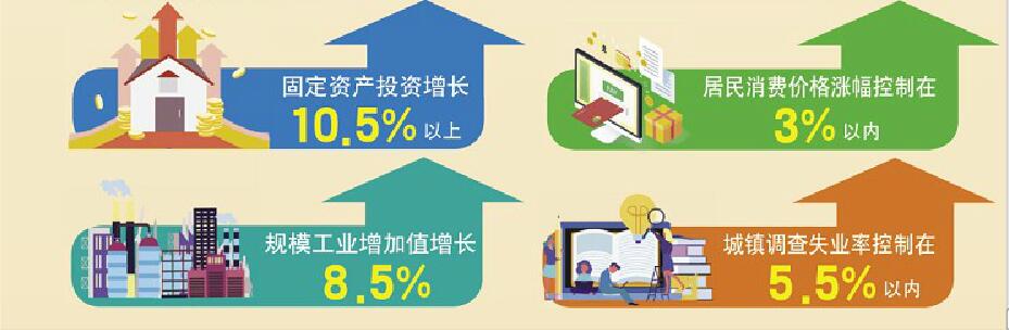 生产总值增长8%以上,固定资产投资增长10.5%以上,规模工业增加值增长8.5%,社会消费品零售总额增长10%以上,地方一般公共预算收入增长7%,居民消费价格涨幅控制在3%以内,全体居民人均可支配收入增速与经济增长基本同步,完成省下达的能耗“双控”目标,城镇调查失业率控制在5.5%以内。在具体工作中,力争取得更好的结果。