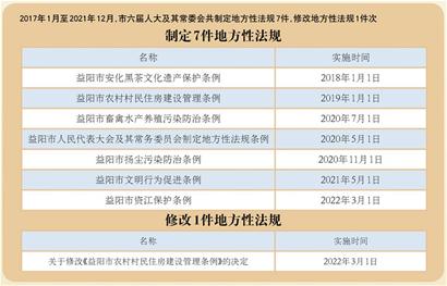 ●力求立法精准管用。制定《益阳市安化黑茶文化遗产保护条例》《益阳市农村村民住房建设管理条例》《益阳市畜禽水产养殖污染防治条例》《益阳市扬尘污染防治条例》《益阳市文明行为促进条例》《益阳市资江保护条例》;审议通过了《益阳市人民代表大会及其常务委员会制定地方性法规条例》。