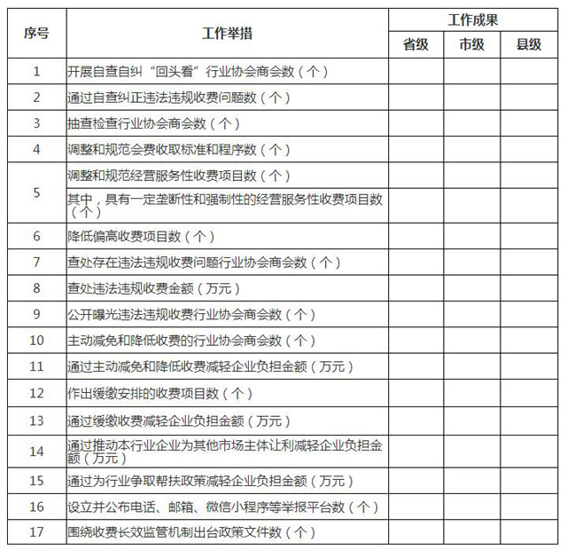 通过“回头看”持续对以下社会和企业反映强烈的行业协会商会乱收费问题进行清理规范和专项整治:1.强制或变相强制入会并收取会费;2.只收取会费不提供服务,或者对会费所包含的基本服务项目重复收取费用;3.利用分支(代表)机构多头收取会费;4.采取“收费返成”等方式吸收会员、收取会费;5.利用法定职责、行政机关委托授权事项或者其他行政影响力违规收费;6.通过评比达标表彰活动收费;7.通过职业资格认定违规收费;8.强制或诱导企业参加会议、培训、展览、考核评比、表彰、出国考察等各类收费活动;9.强制市场主体提供赞助、捐赠、订购有关产品或刊物;10.以设立分支机构、代表机构的名义收取或变相收取管理费、赞助费;11.以担任理事、常务理事、负责人为名向会员收取除会费以外的其他费用;12.会费标准未按规定程序制定或修改;13.具有一定垄断性和强制性的经营服务性收费项目未按要求进行调整和规范;14.实行市场调节价格的经营服务性收费项目收费标准不合理;15.其他企业和群众反映强烈的乱收费行为。