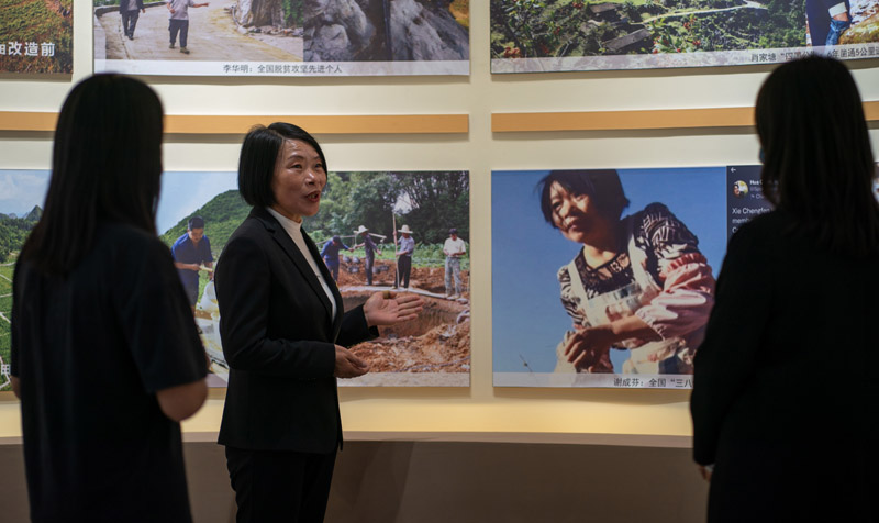 二十大代表谢成芬在云南省西畴县“西畴精神”展览馆里讲述治理石漠的故事(2022年3月26日摄)。新华社记者 江文耀 摄