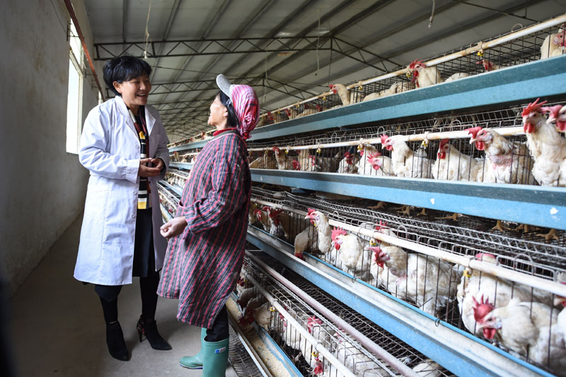 二十大代表余留芬(左)在养殖场内与工作人员交谈(2017年10月29日摄)。新华社记者 欧东衢 摄
