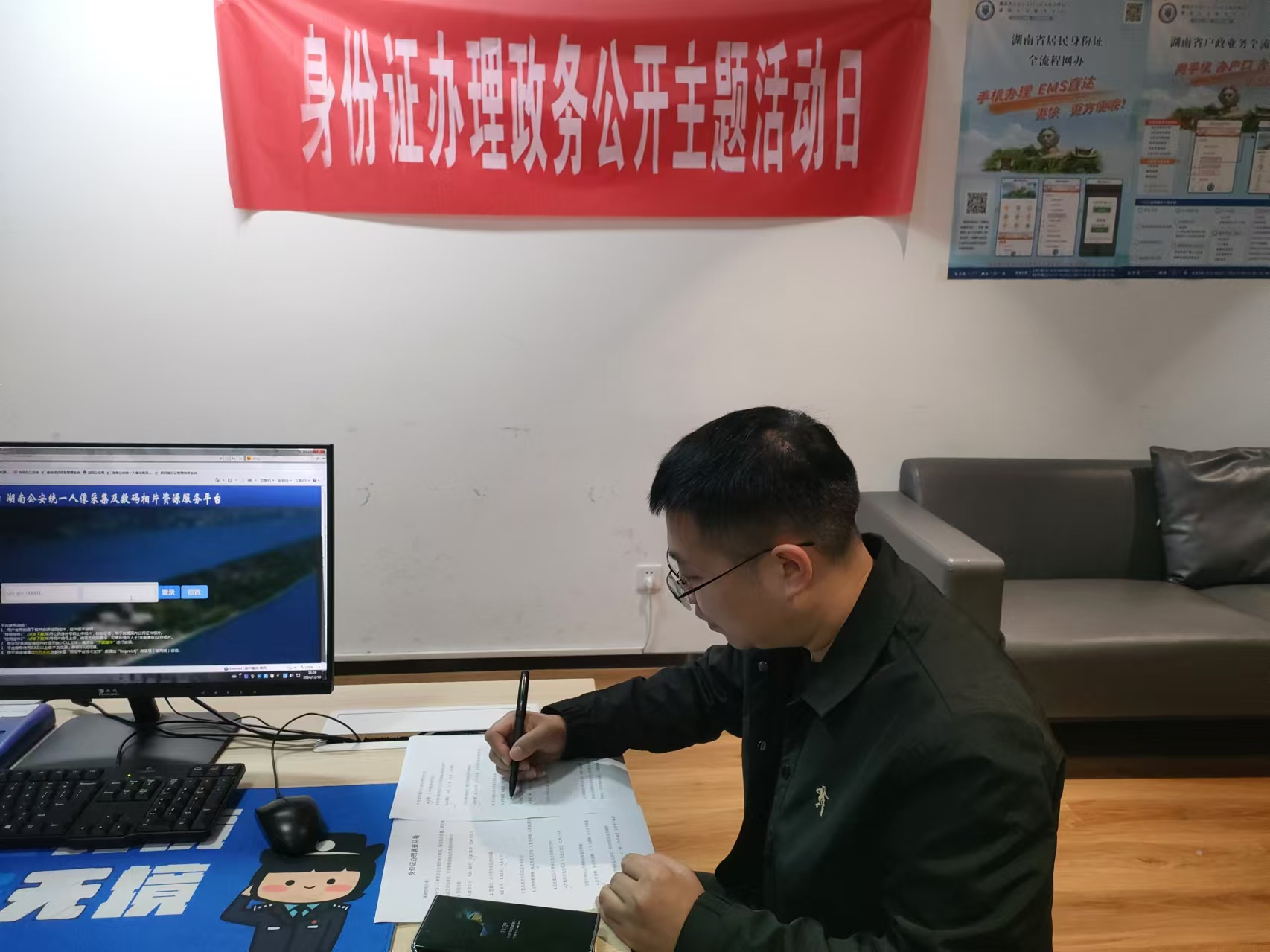 11月18日,益阳市公安局人口与出入境管理支队在市民服务中心开展“政务公开主题日”活动,对前来办理身份证的群众进行“身份证办理体验”问卷调查。