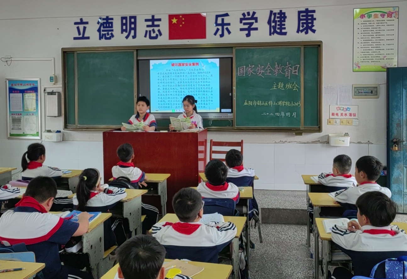 “政治安全”“军事安全”“生物安全”…… 今年是习近平总书记提出总体国家安全观十周年,4月15日是第九个全民国家安全教育日。4月15日,湖南城市学院附属梓山湖学校五年级班会课上,班主任老师就“国家安全教育”话题一提问,学生们纷纷举手抢答,小组间进行一场又一场知识抢答赛,既新颖有趣,又增长见识。