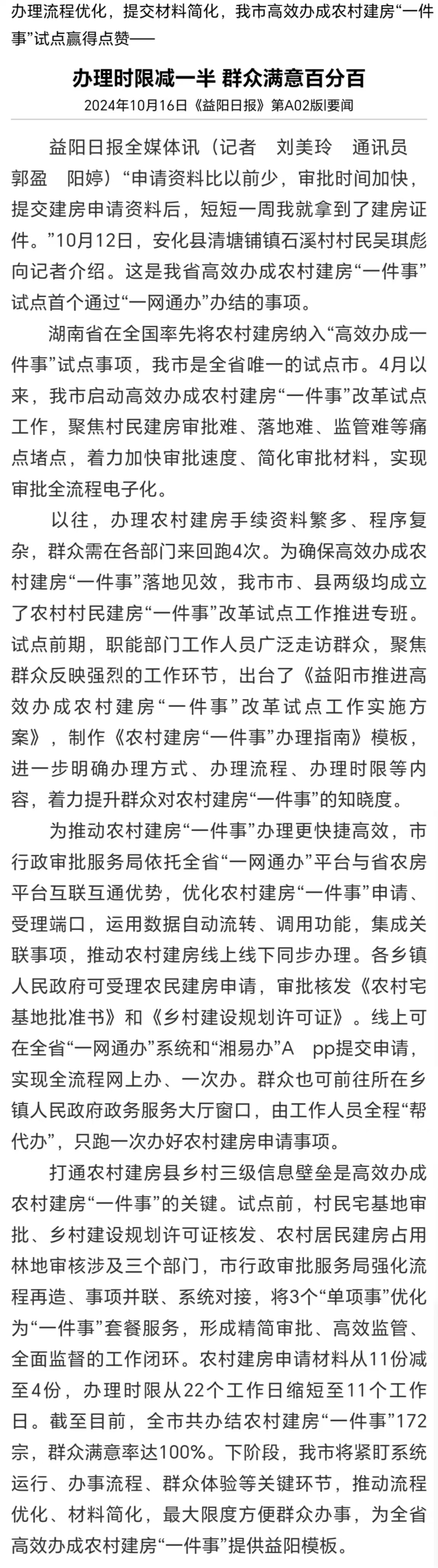 办理流程优化,提交材料简化,我市高效办成农村建房“一件事”试点赢得点赞—— 办理时限减一半 群众满意百分百