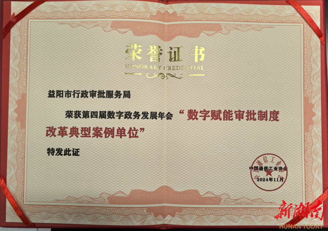 湖南日报·新湖南客户端11月13日讯(通讯员 郭盈)日前,在2024第四届数字政务发展年会上,益阳“‘五办’革新,打造基层证明线上开具专区”获评全国“数字赋能审批制度改革典型案例”。